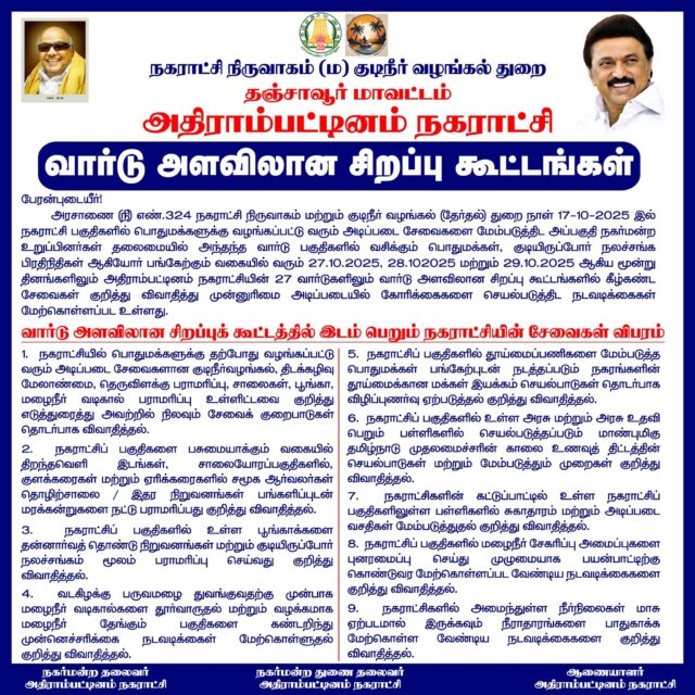 அதிராம்பட்டினம் நகராட்சியில் வார்டு அளவிலான சிறப்பு கூட்டங்கள் – பொதுமக்கள் பங்கேற்க அழைப்பு Khalid2025-10-27T00:37:10+05:30அதிராம்பட்டினம் நகராட்சியில், பொதுமக்களின் நலனையும் தேவைகளையும் நேரடியாக அறிந்து உடனடி தீர்வுகள் வழங்கும்... Facebook Twitter LinkedIn Google + Email October 27, 2025அதிரை செய்திகள், அறிவிப்புகள், செய்திகள் Read more...