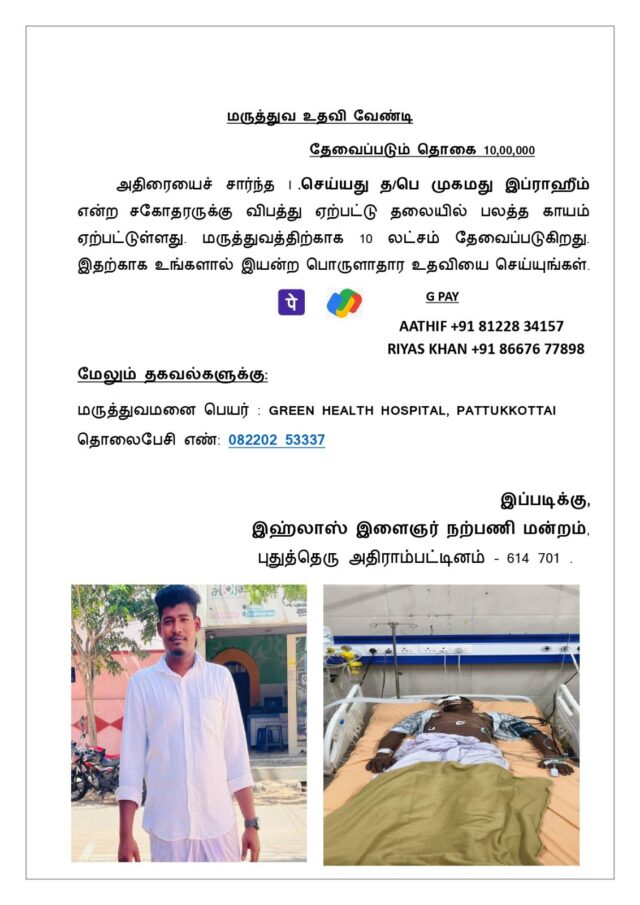 அதிராம்பட்டினம் இளைஞர் சிகிச்சைக்காக 10 லட்சம் ரூபாய் உதவி தேவை Khalid2025-10-27T23:18:48+05:30அதிராம்பட்டினத்தைச் சேர்ந்த இளைஞர் சார்ந்த இ. செய்யது த.பெ. முகமது இப்ராஹீம் என்பவர்,... Facebook Twitter LinkedIn Google + Email October 27, 2025அதிரை செய்திகள், செய்திகள் Read more...