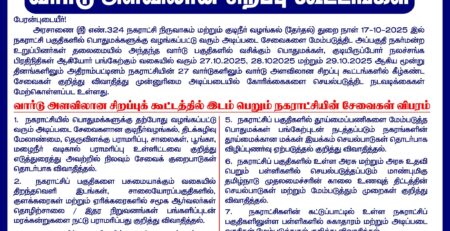 அதிராம்பட்டினம் நகராட்சியில் வார்டு அளவிலான சிறப்பு கூட்டங்கள் – பொதுமக்கள் பங்கேற்க அழைப்பு Khalid2025-10-27T00:37:10+05:30அதிராம்பட்டினம் நகராட்சியில், பொதுமக்களின் நலனையும் தேவைகளையும் நேரடியாக அறிந்து உடனடி தீர்வுகள் வழங்கும்... Facebook Twitter LinkedIn Google + Email October 27, 2025அதிரை செய்திகள், அறிவிப்புகள், செய்திகள் Read more...