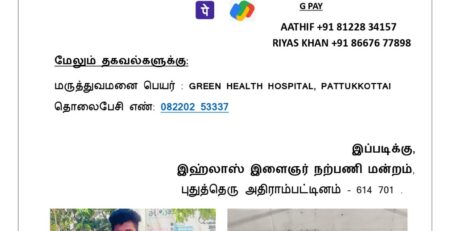 அதிராம்பட்டினம் இளைஞர் சிகிச்சைக்காக 10 லட்சம் ரூபாய் உதவி தேவை Khalid2025-10-27T23:18:48+05:30அதிராம்பட்டினத்தைச் சேர்ந்த இளைஞர் சார்ந்த இ. செய்யது த.பெ. முகமது இப்ராஹீம் என்பவர்,... Facebook Twitter LinkedIn Google + Email October 27, 2025அதிரை செய்திகள், செய்திகள் Read more...
